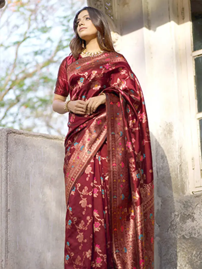 JANASYA Women’s Banarasi Floral Silk Saree, Wine Colour with Unstitched Blouse Piece.
